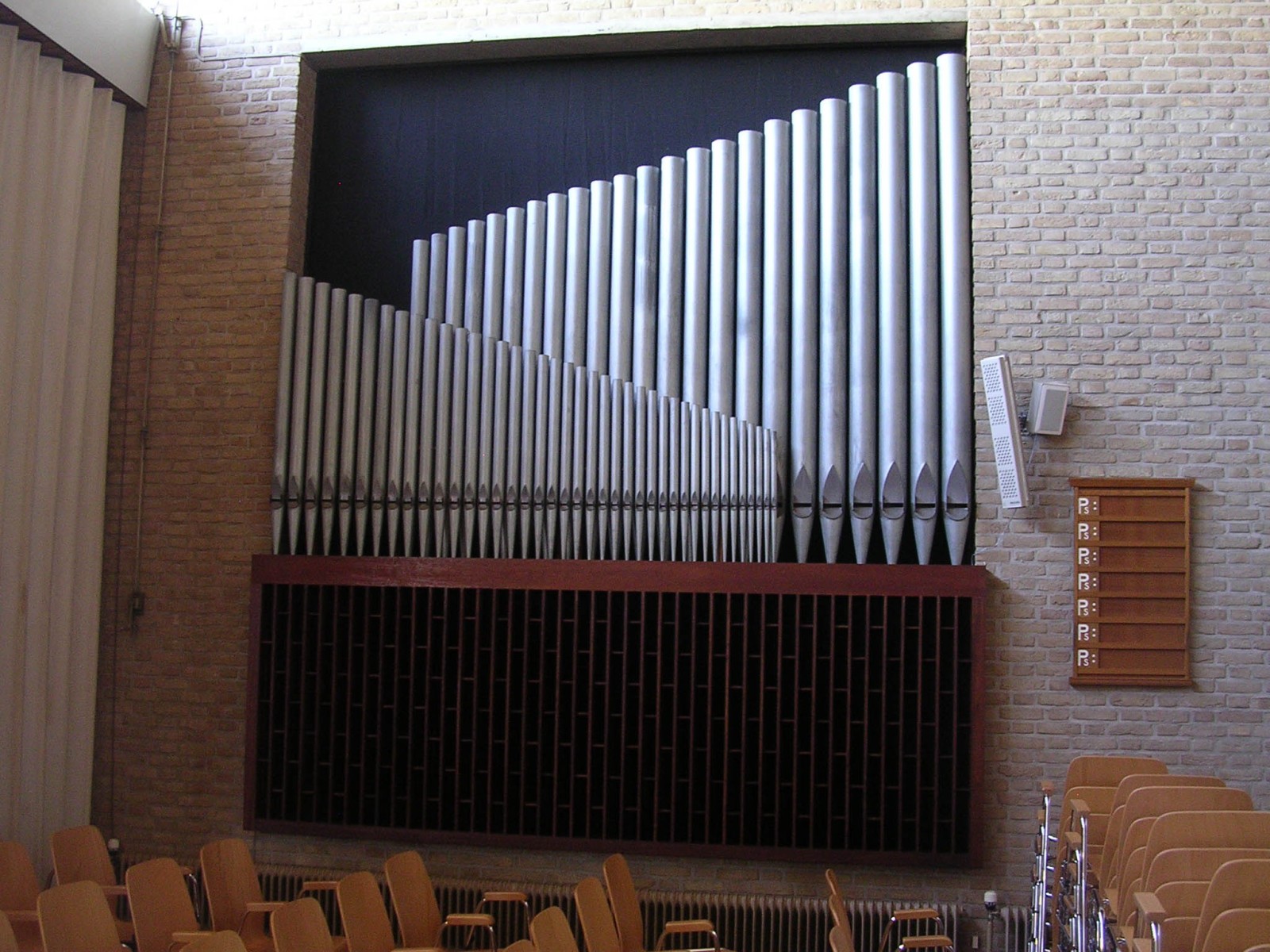 Orgelbouwer: Achter het front staan luidsprekers. Er is een elektronisch orgel aanwezig